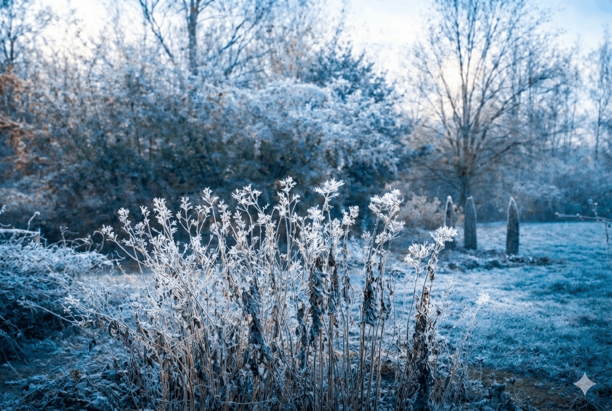 Foto bovenaan: eerste vorst in onze ecologische tuin.